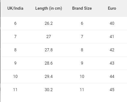 Sizes in CM: 26.2, 27, 27.8, 28.6, 29.4