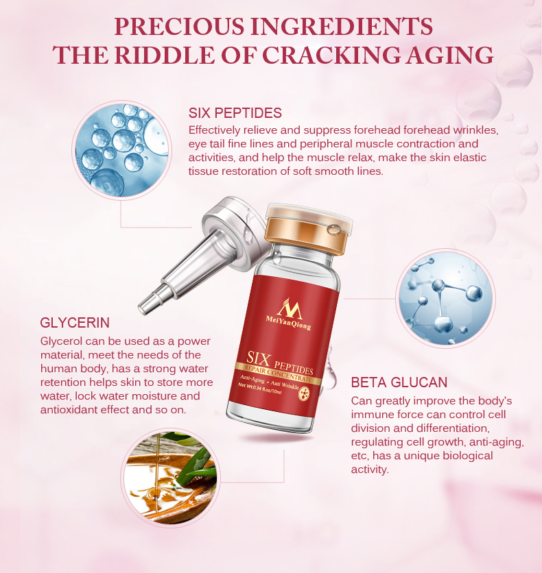 Research shows that six liquid peptides can effectively inhibit the skin and soothe all kinds of fine lines, leaving skin supple and smooth elastic tissue.